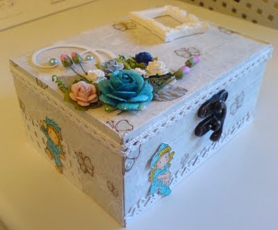Vous allez pouvoir gagner cette jolie boîte scrappée par mes petites mimines, des fleurs, des rubans, des scrapbidules ainsi qu'un lot de 10 papiers Magnolia 6x6 (format carterie).Je rajouterais des empreintes ainsi que des découpes.